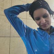 This POV wetlook video offers a more immersive experience as Alessia appears fully dressed in a layered outfit: a blue cardigan, black leather cargo pants, winter boots, and a black leather-look overall underneath.