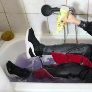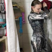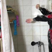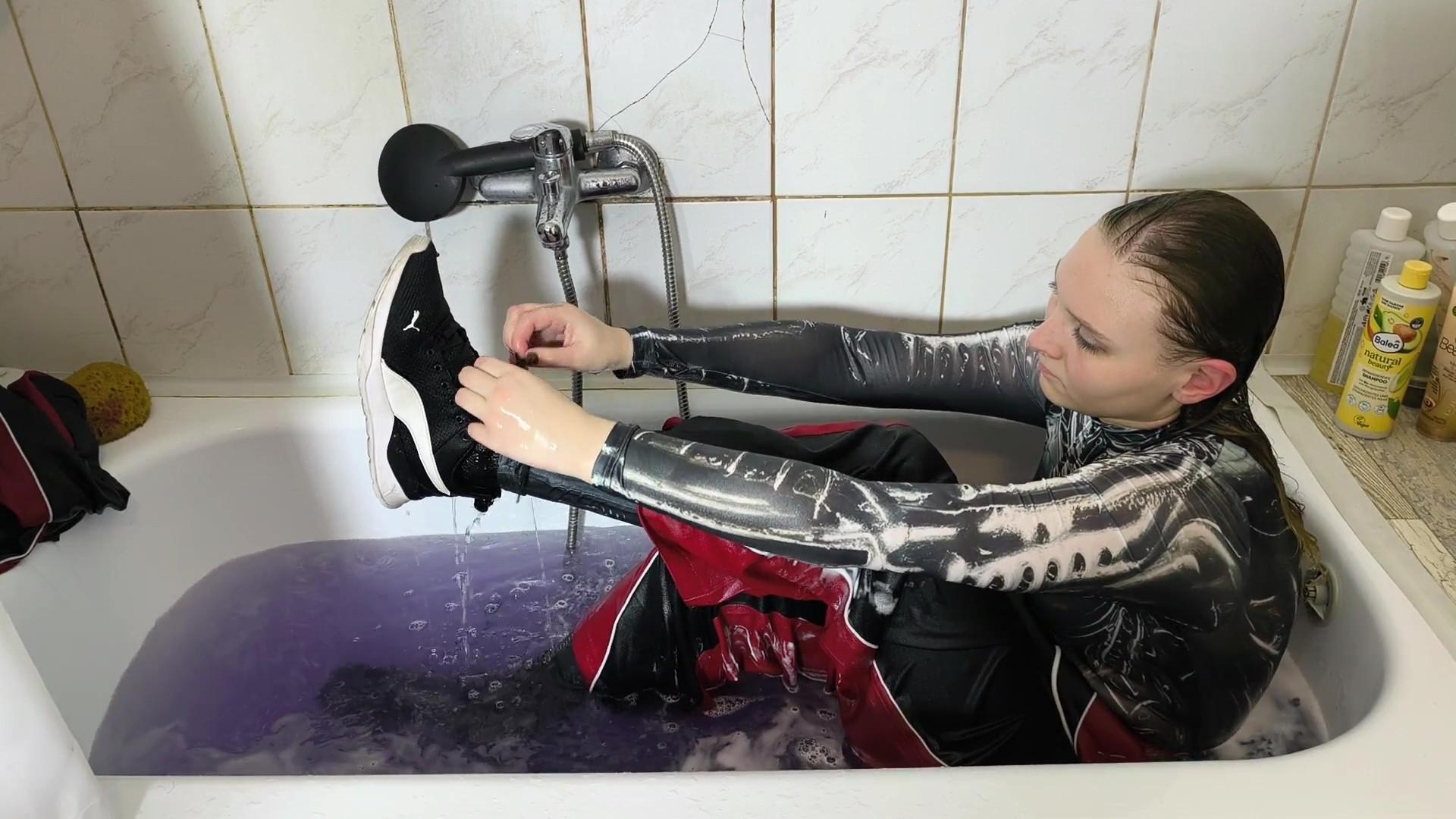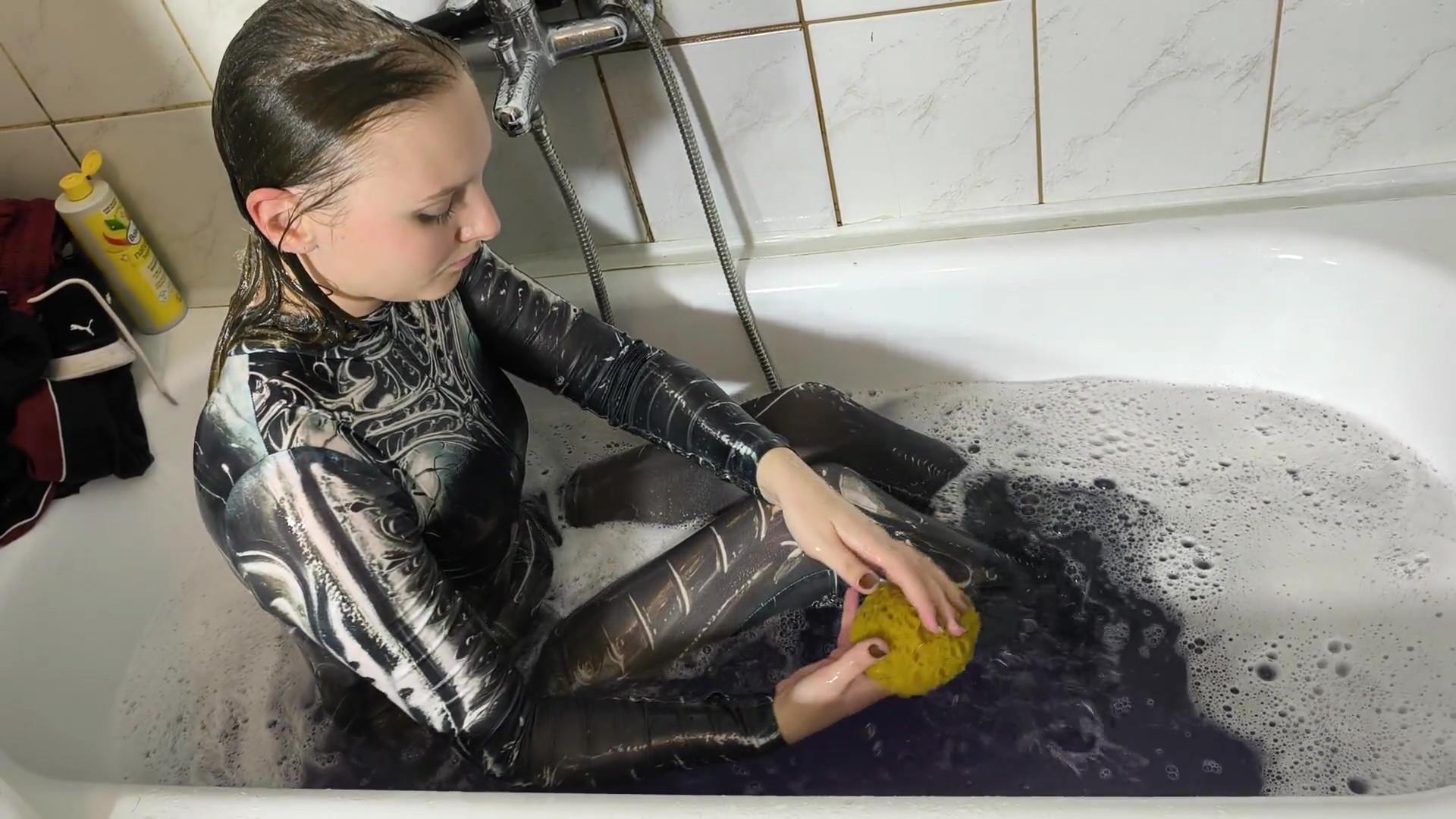 Luna starts in a full tracksuit and slowly soaks it through in the tub, letting the fabric get completely wet and cling to her body. Once everything is fully drenched, she removes the tracksuit to reveal the black overall underneath, continuing the session in the water.