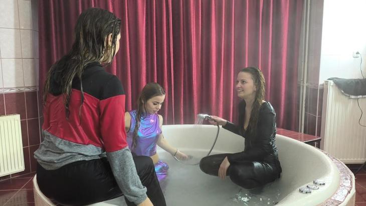The video combines bright outfit contrast, glossy wet fabric, and a much more chaotic group dynamic as the three of them crowd into the jacuzzi, spray each other with the shower head, splash around, and keep the atmosphere loose and fun from start to finish. The shiny purple outfit in the middle stands out strongly against the darker soaked clothes, adding an extra visual kick to the whole scene.