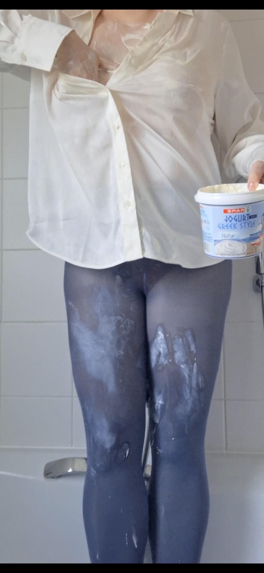 YOGHURT ON MY WHITE SATIN BLOUSE & BOOBS & into my nylon leggings ππ€π€π¦