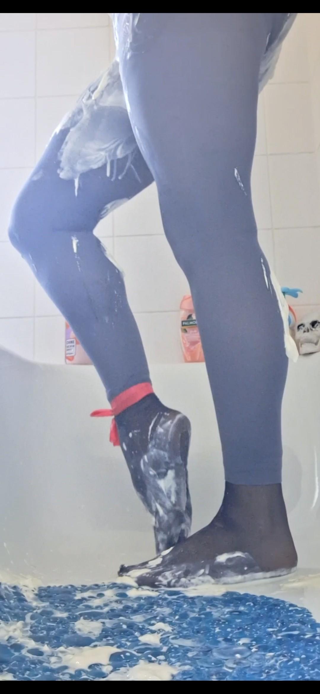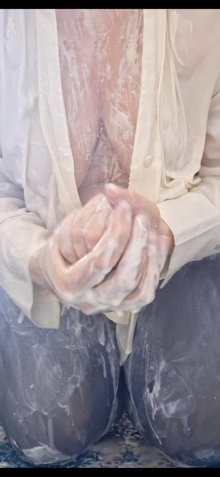 SITTING IN THE BATHTUB & SQUEESHING MY YOGHURT BOOBS IN WHITE SATIN BLOUSE