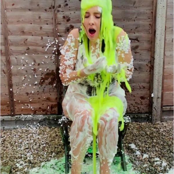 Erin Moore has arrived late for swim practice and her coach has decided she needs to face a forfeit. She's sat on a chair wearing her rather revealing one piece swimsuit surrounded by 4 buckets of gunge. First she is covered in foam by her coach. The first bucket of gunge is then thrown over her. She protests as more gunge and foam are poured and sprayed over her before the camera is picked up to give you a close up of Erin completely trashed after her gungey forfeit!