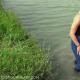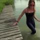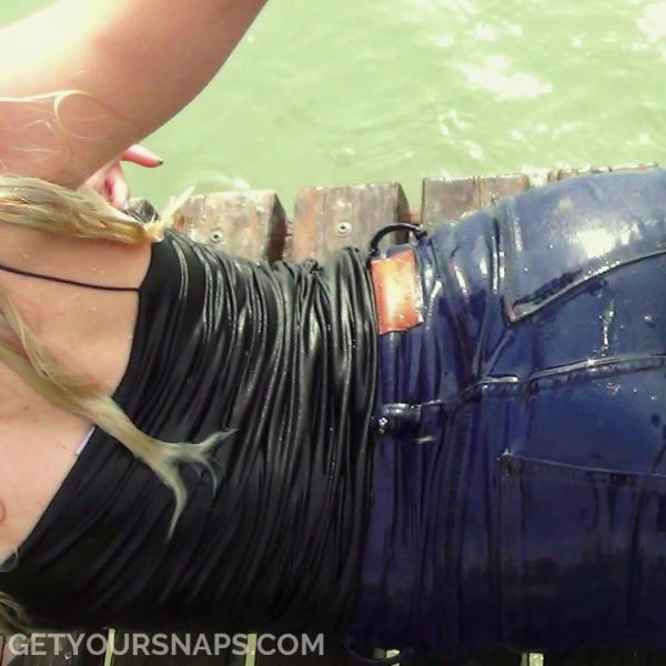 Vickey went for a swim in the lake in black shoes and tight jeans. After swimming a bit, she climbed out and walked over to the other side, where she splashed herself with water from a bottle. She enjoyed the way the dress sparkled on her. It was an amazing sight.