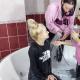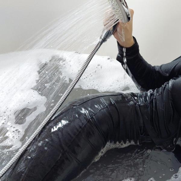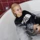 Mona and Gina were already taking a bath with their clothes on when Nika arrived. Mona quickly invited her into the bathtub, where they bathed her, washed her hair, and then left Nika to enjoy the hot shower alone with her clothes on.